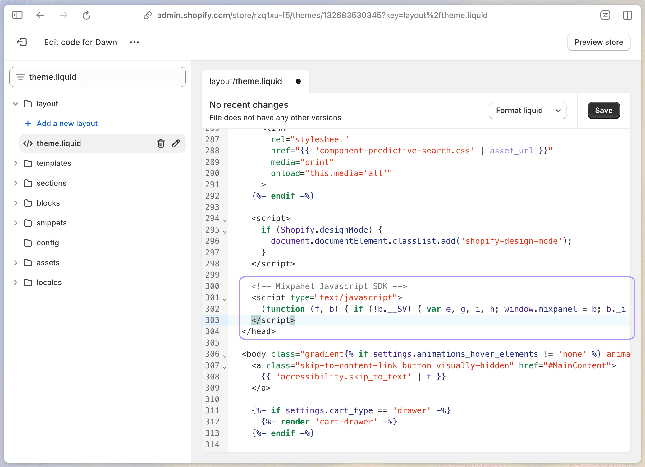 theme.liquidfile, enable Mixpanel’s SDK by adding your Project Token to themixpanel.initcode (wrapped inscripttags). Altogether, it should look like this: